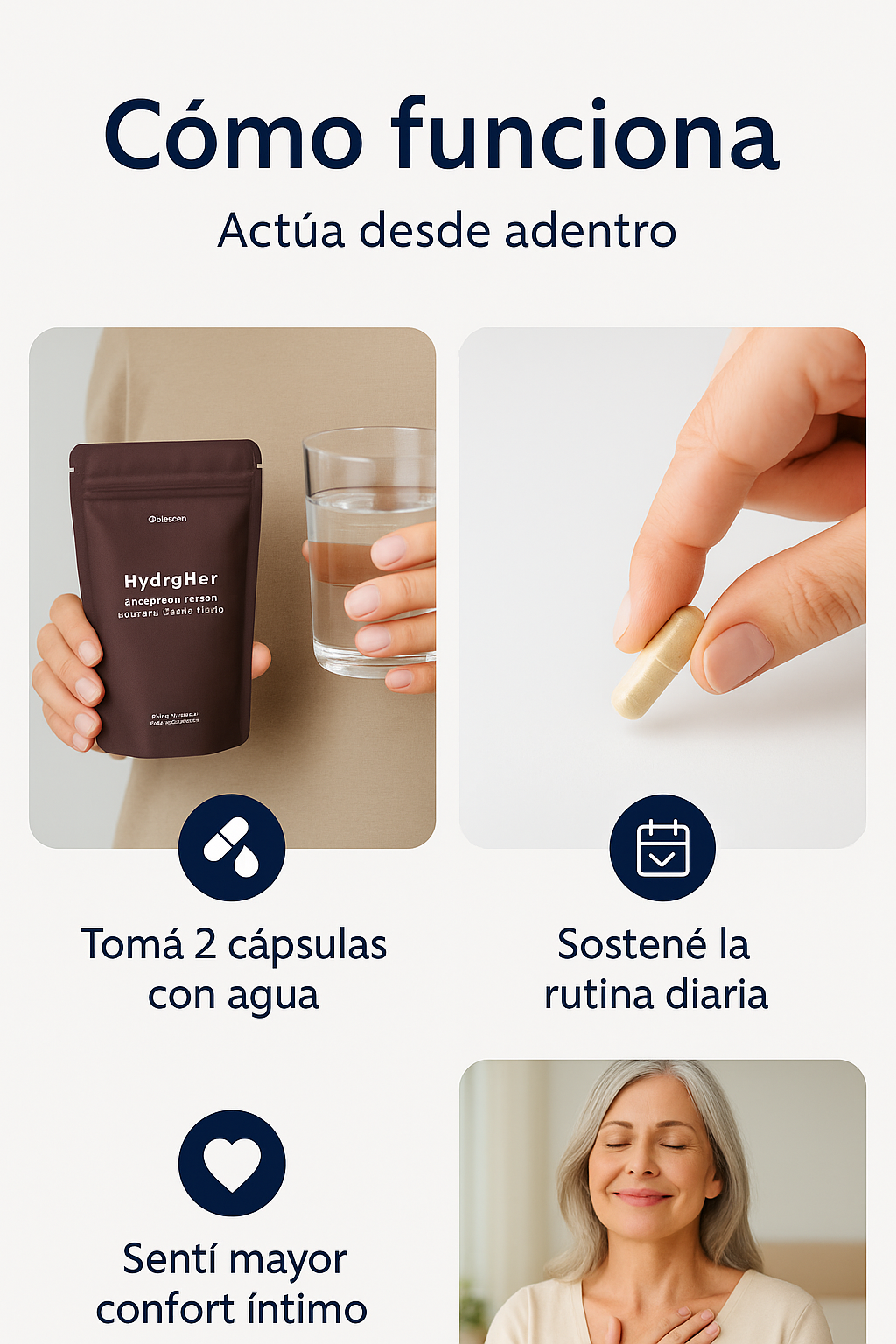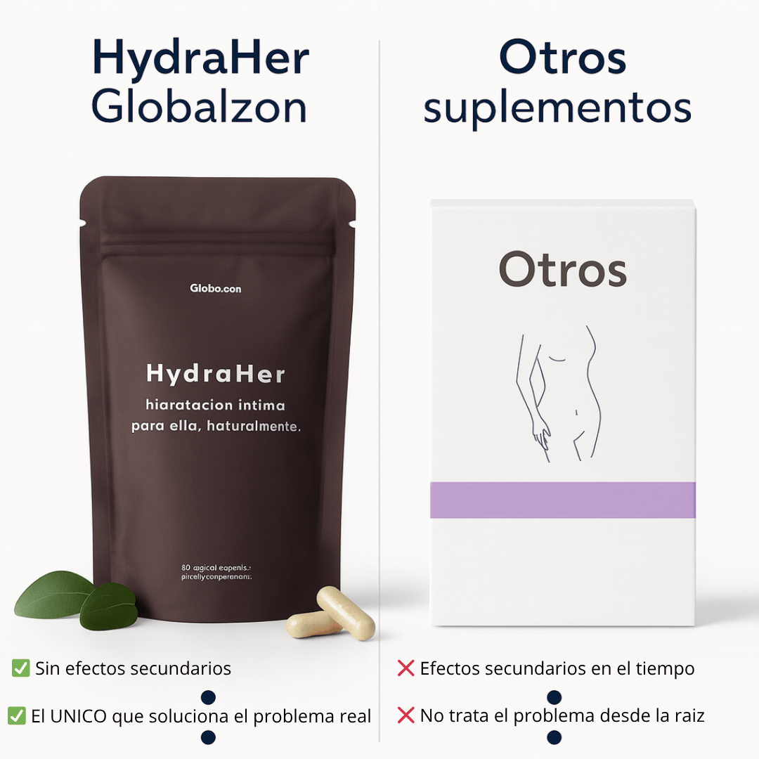 HydraHer Globalzon es un suplemento con ingredientes de origen natural que acompaña el bienestar de las mucosas y la hidratación interna, incluyendo la zona íntima. No actúa como un medicamento, sino como parte de una rutina de autocuidado que podés sumar a tus hábitos saludables.