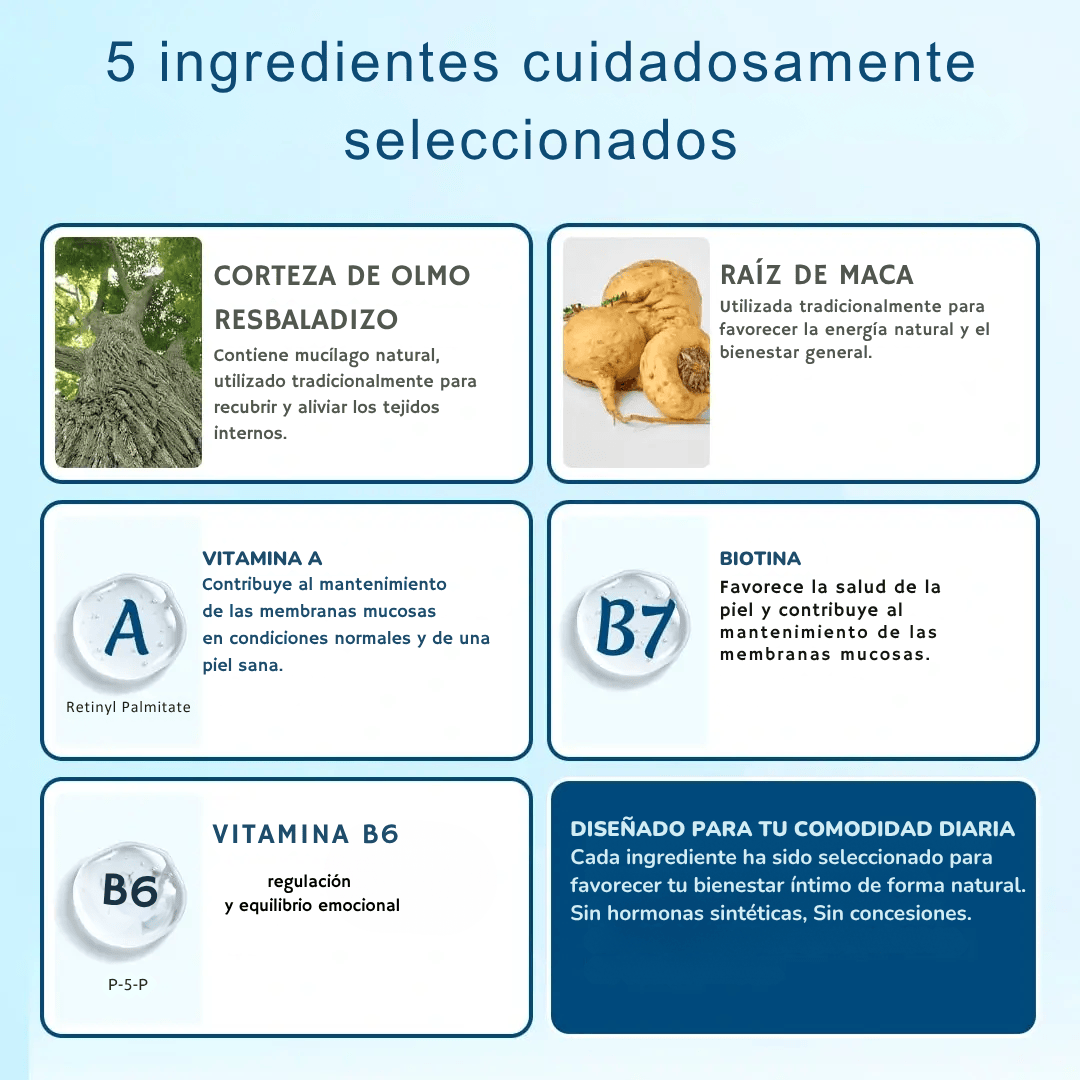 Ingredientes como la corteza de olmo resbaladizo y vitaminas específicas colaboran en el cuidado de las mucosas, incluyendo la zona íntima, ayudando a que te sientas más cómoda en el día a día.